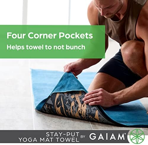 The Gaiam Stay-Put Yoga Towel is a hypoallergenic microfiber that absorbs twice as much as standard cotton, and dries in half the time. Features four corner pockets on the backside which holds onto the mat and secure the towel in place and prevents bunching. Fits over a standard size yoga mat (68″L x 24″W).