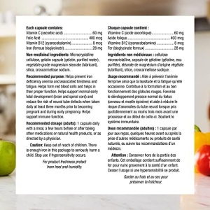 Each Capsule Contains: 28 mg of Ferrous Bisglycinate Iron, 8 mcg of Vitamin B12, 400 mcg of Folic Acid and 60 mg of Vitamin C. Together, these supplement help support healthy red blood cells and immune function