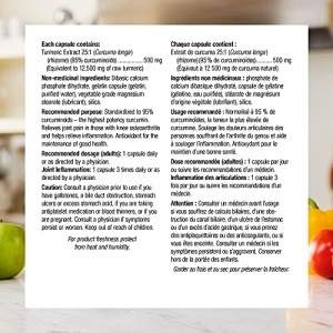 Raw Herb Calculation: Each capsule delivers 500 mg of turmeric extract standardized to 95% curcuminoids (raw herb calculation: 500 mg of 25:1 extract = 12,500 mg raw herb)